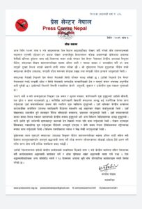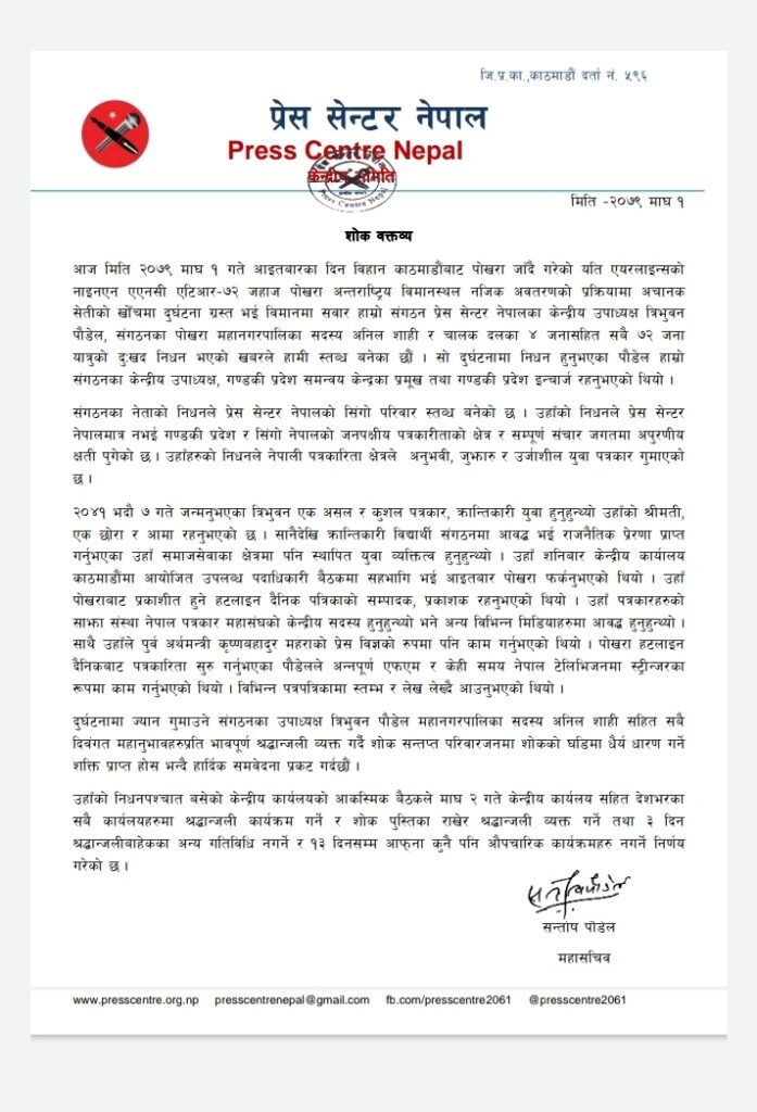 आज मिति २०७९ माघ १ गते आइतबारका दिन विहान काठमाडौंबाट पोखरा जाँदै गरेको यति एयरलाइन्सको नाइनएन एएनसी एटिआर–७२ जहाज पोखरा अन्तराष्ट्रिय विमानस्थल नजीक अवतरणको प्रक्रियामा अचानक सेतीको खोँचमा दुर्घटना ग्रस्त भई विमानमा सवार हाम्रो संगठन प्रेस सेन्टर नेपालका केन्द्रीय उपाध्यक्ष त्रिभुवन पौडेल, संगठनका पोखरा महानगरपालिका सदस्य अनिल शाही र चालक दलका ४ जनासहित सबै ७२ जना यात्रुको दुःखद निधन भएको खबरले हामी स्तव्ध बनेका छौं । सो दुर्घटनामा निधन हुनुभएका पौडेल हाम्रो संगठनका केन्द्रीय उपाध्यक्ष, गण्डकी प्रदेश समन्वय केन्द्रका प्रमूख तथा गण्डकी प्रदेश इन्चार्ज रहनुभएको थियो ।