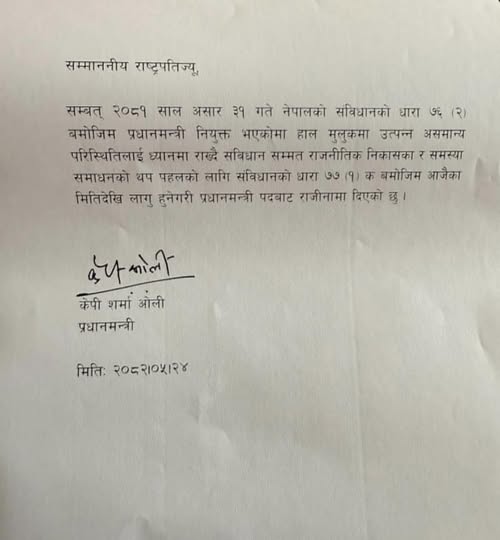 काठमाडौं । देशभर जेनजी पुस्ताले थालेको आन्दोलन चर्किएसँगै प्रधानमन्त्री केपी शर्मा ओलीले पदबाट राजीनामा दिएका छन् । प्रधानमन्त्रीको सचिवालयले मंगलबार बिहान ओलीले पदत्याग गरेको जानकारी दिएको हो ।