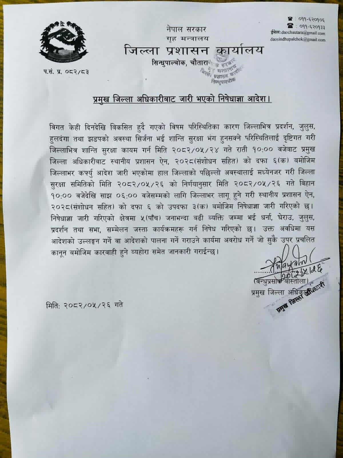 चौतारा, सिन्धुपाल्चोक । शान्ति सुरक्षा र सामाजिक सद्भाव कायम राख्ने उद्देश्यले जिल्ला प्रशासन कार्यालय सिन्धुपाल्चोकले आज (बुधबार) बिहान १०:०० बजेदेखि बेलुकी ६:०० बजेसम्म निषेधाज्ञा लागू गरेको छ ।
