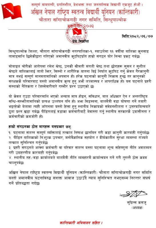 ११ वर्षीया बालिका कुटपिटप्रति अनेरास्ववियु (क्रान्तिकारी)को कडा विरोध