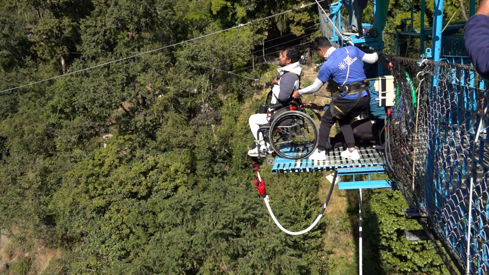 दुवैजनालाई विशेष सुरक्षा हार्नेसले बाँध्ने क्रममा पुलमा एकछिन मौनता छायो। सापकोटा ह्विलचेयरमै स्थिर भएर बसेका, शिशिर दाहाल आफ्नै ठाउँमा तयारीमा। सुरक्षाकर्मीले स्ट्र्याप–स्ट्र्याप जाँच्दै जाँदा दुबैको अनुहारमा अनौठो संयम देखिन्थ्यो । दिलिपलाइ पुलबाट बन्जि प्वाइन्टमा क्र्यु मेम्बरले सोधे-कस्तो अनुभव हुँदैछ ? दिलिपले भने -‘फिलिङ एक्साइटेड’ ।