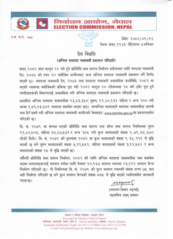 काठमाडौं/ निर्वाचन आयोगले आगामी फागुन २१ गते हुने प्रतिनिधि सभा सदस्य निर्वाचनका लागि आज अन्तिम मतदाता नामावली प्रकाशन गरेको छ।
