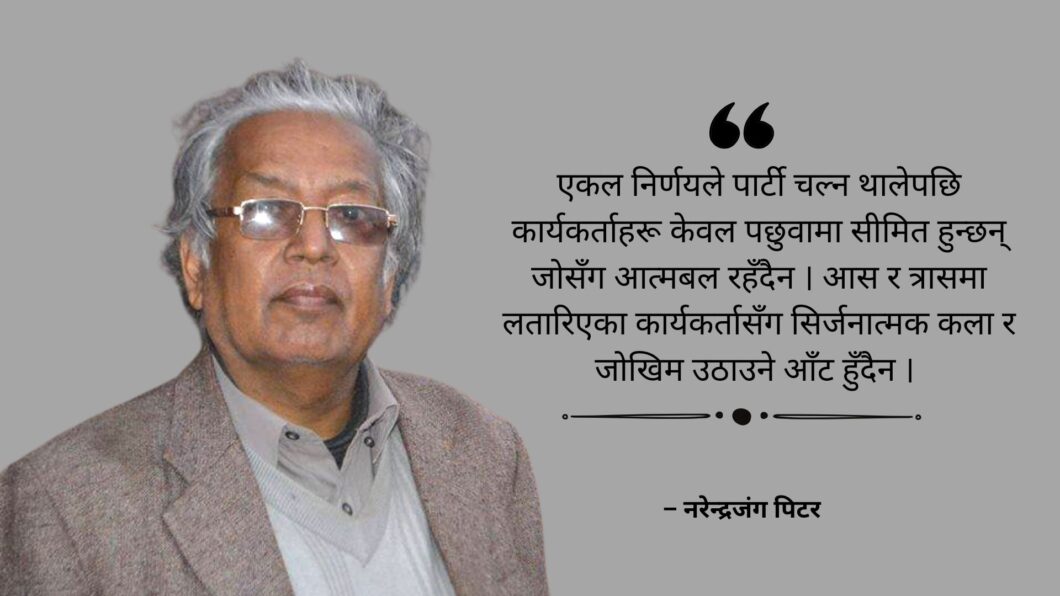 विचार व्यवहारमा नदेखिँदा त्यो पाखण्ड बन्छ । पार्टी चल्दैन । एकल निर्णयले पार्टी चल्न थालेपछि कार्यकर्ताहरू केवल पछुवामा सीमित हुन्छन् जोसँग आत्मबल रहँदैन । आस र त्रासमा लतारिएका कार्यकर्तासँग सिर्जनात्मक कला र जोखिम उठाउने आँट हुँदैन ।
