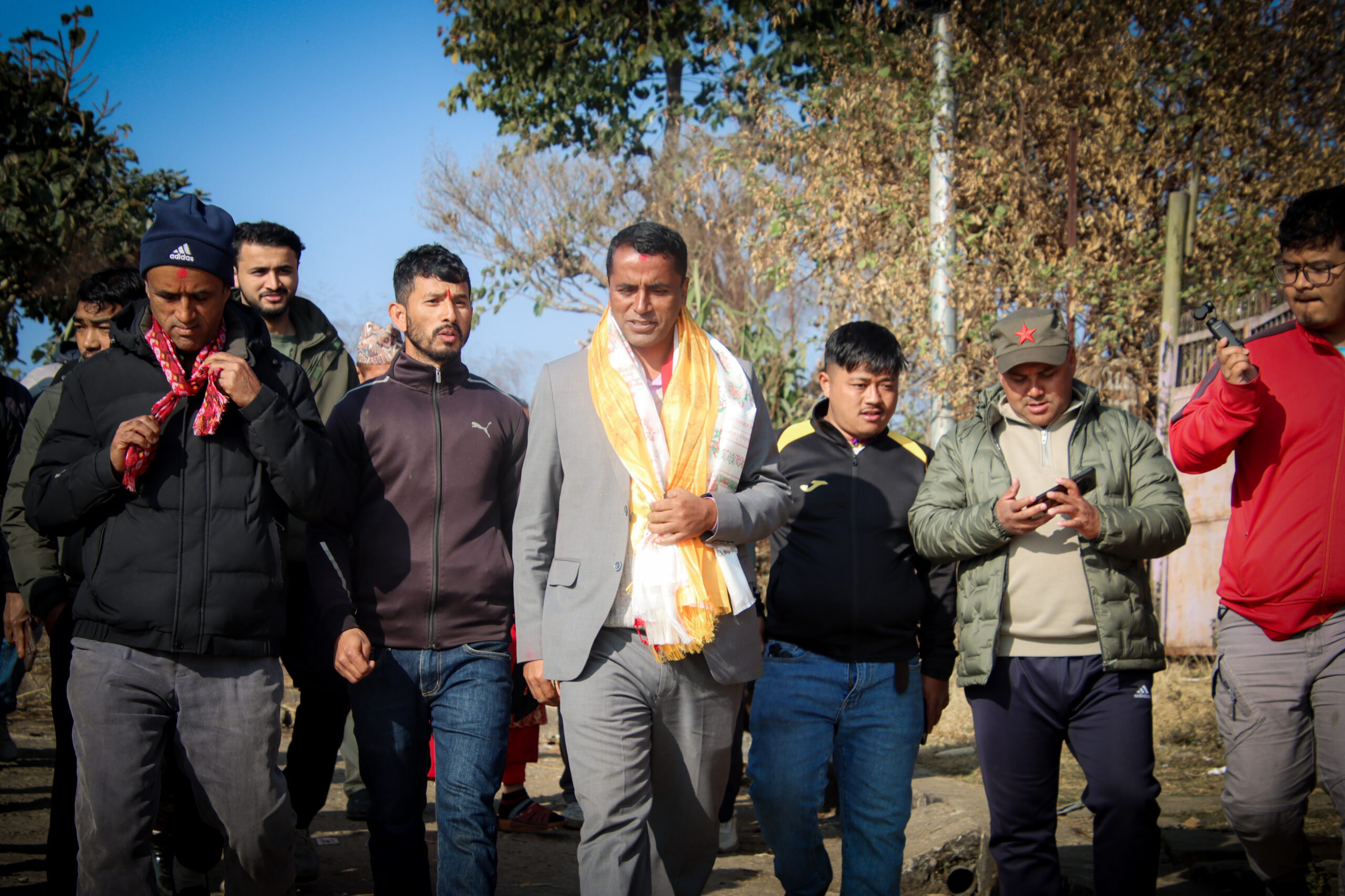 गुलाब बोकेर मतदाता भेट्दै युवा उम्मेदवार समिर श्रेष्ठ
